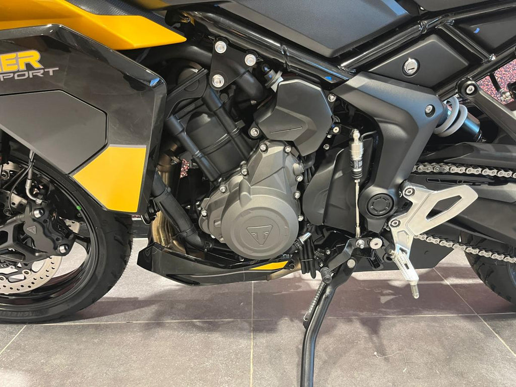 Built on a nimble yet sturdy chassis, the Tiger Sport features a tubular steel frame mated to a non-adjustable inverted 41mm Showa cartridge fork and a preload-adjustable Showa monoshock rear suspension. With 150mm of travel front and rear, it offers sharp handling and rider comfort across highways and twisty backroads.