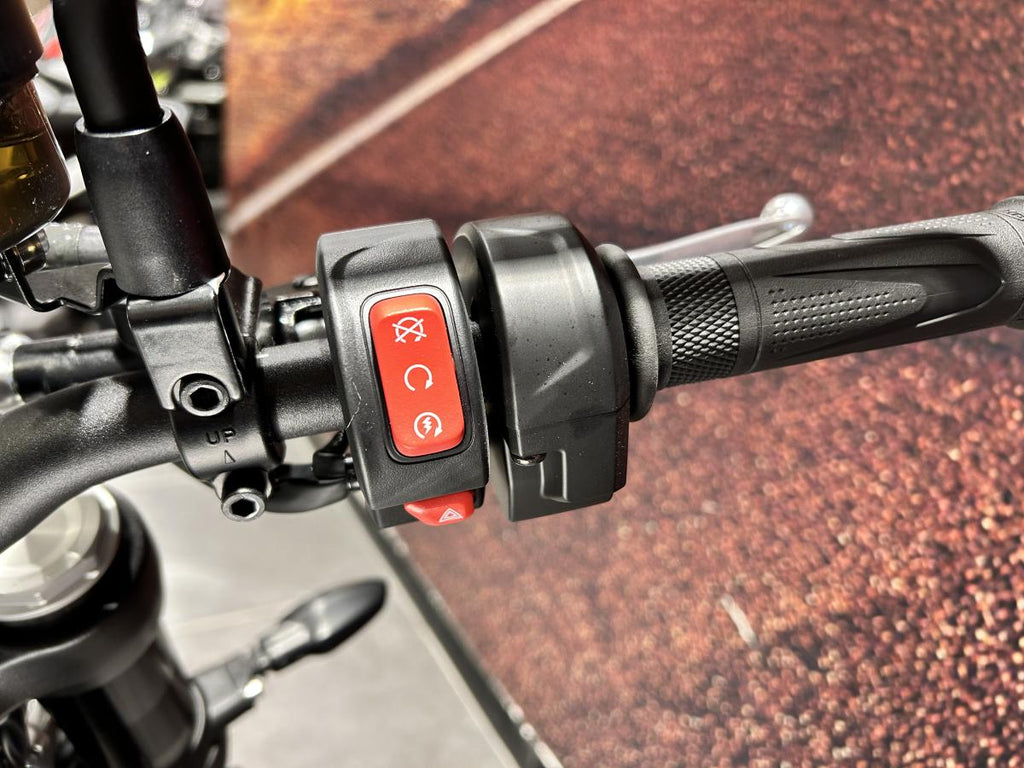 The minimalist instrument cluster includes an analogue speedometer with a digital display for fuel level, gear position, and trip information. Ride-by-wire throttle enables two riding modes — Road and Rain — plus switchable traction control to fine-tune the experience in changing conditions.