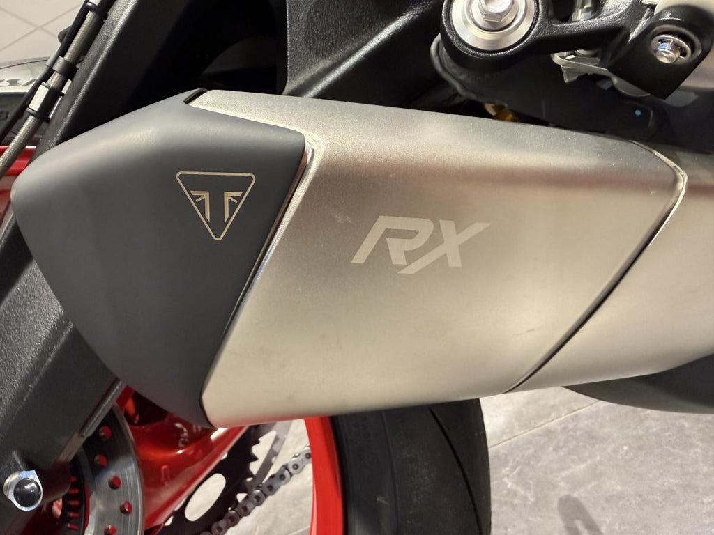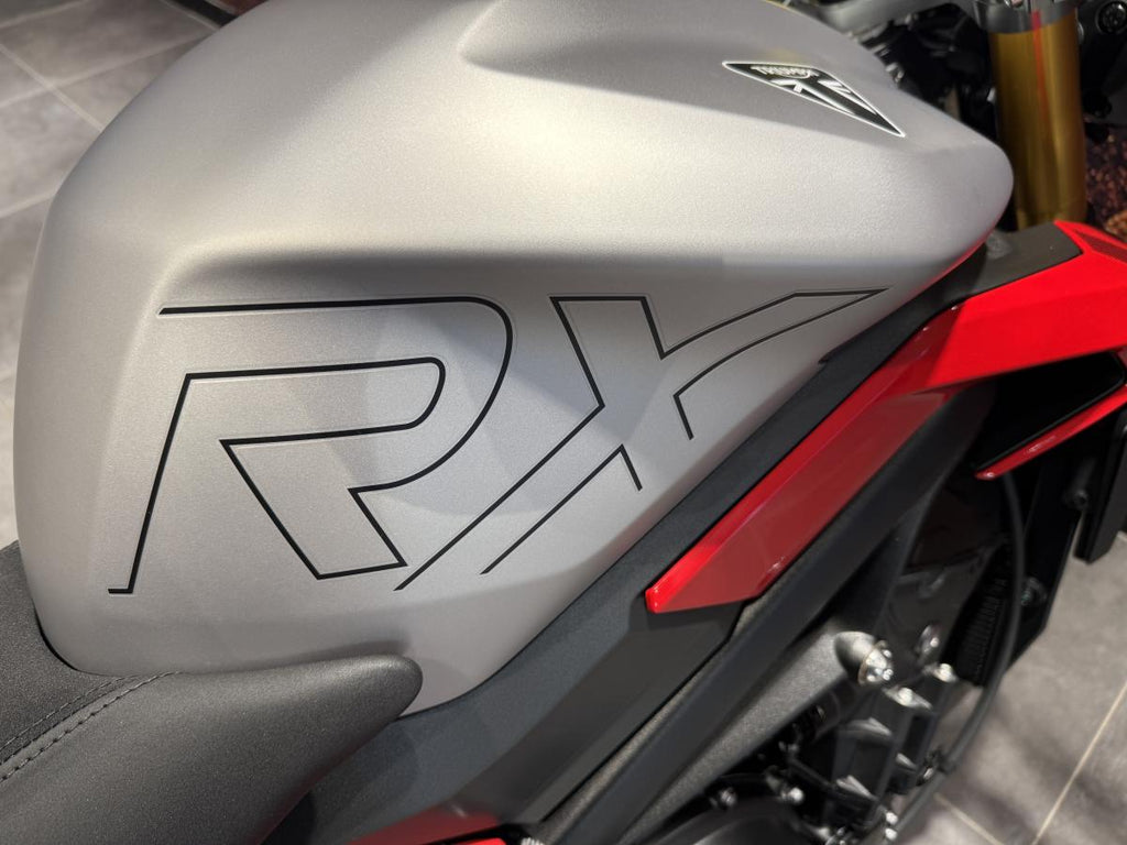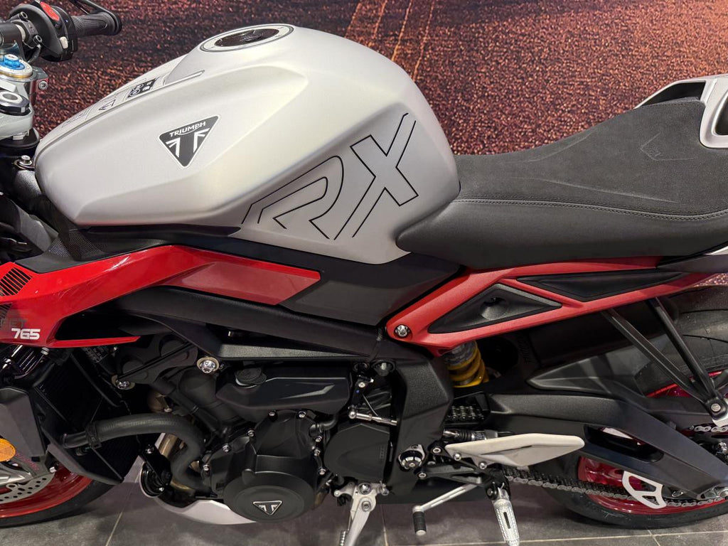 At its heart is the 765 cc inline three-cylinder engine derived from Triumph’s Moto2™ racing programme, offering exhilarating power and thrilling rev-life. While the official spec for the RX variant is not always separately listed, the related 765 RS model produces 130 PS (128.2 bhp) at 12 000 rpm and 80 Nm torque at 9 500 rpm.