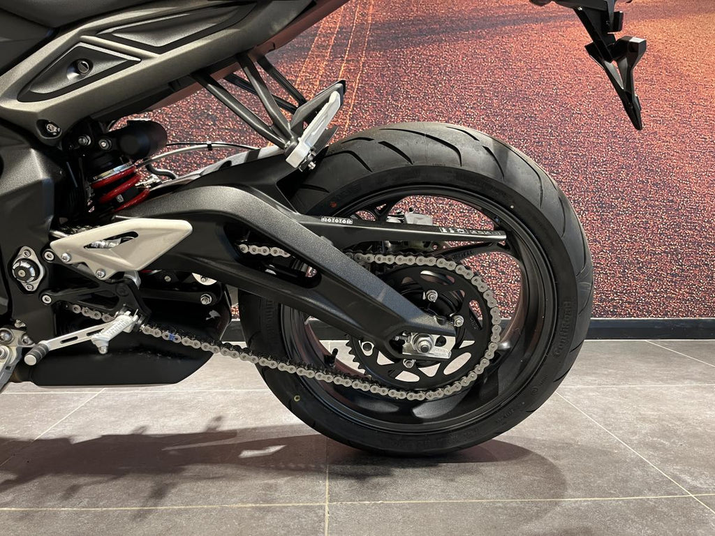 Underneath the sculpted bodywork lies a compact 765 cc liquid‑cooled inline three-cylinder engine, delivering 120 PS at 11,500 rpm and 80 Nm of torque at 9,500 rpm. Built with a 240° crank and Moto2-derived internals, the motor delivers thrilling acceleration across the RPM range, a rich triple roar, and a throttle that responds with race-bike intent.